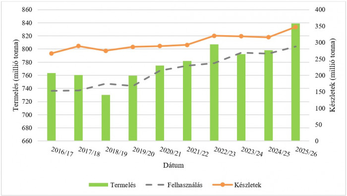 A FAO legfrissebb, 2026-ra vonatkozó globális gabonatermelési előrejelzését áprilisban 0,2 %-kal emelték, amivel a termelés 5,8 %-kal magasabb az előző évhez képest (1. ábra).